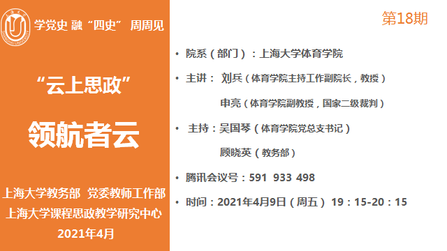 4月9日晚,“学党史,融‘四史’,周周见”云上思政课程第十八期于线上举行。本次云上思政课程由yl23455永利公司党总支书记吴国琴、yl23455永利教务部副部长顾晓英联袂担任主持,yl23455永利主持工作副经理、教授刘兵,yl23455永利副教授、国家二级裁判申亮担任主讲,公司各院系师生同聚“云”端,在“线”参与。