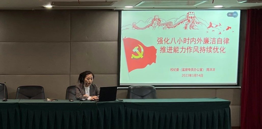 会议第二项内容是由yl23455永利纪检监察干部周洋洋老师作党的二十大精神学习的专题报告,报告题目为《强化八小时以外廉洁自律,推进能力作风持续优化》。周老师向大家介绍了当前全面从严治党的形势判断和部署安排,从提升党员领导干部作风修养的角度出发,系统介绍了新时代高校对党员领导干部八小时内外廉洁自律的要求。她指出廉洁自律是党员领导干部必备的政治品格,是防腐防变的第一道防线。“八小时外”行为隐蔽,危害巨大,作为一名高公司党员干部要从廉洁自律做起,自觉约束八小时内外言行,明大德、守公德、严私德,自觉养成高尚的精神追求和健康的生活情趣,慎独、慎始、慎微、慎终,以清正廉洁的精神风貌为公司建成世界一流、特色鲜明的综合性研究型大学提供坚强保障。报告内容结合实际,深入浅出、案例详实,既帮助大家了解了全面从严治党的形势任务,又给大家生动的上了一节廉洁自律课,为大家在八小时之外的行为敲响了警钟。